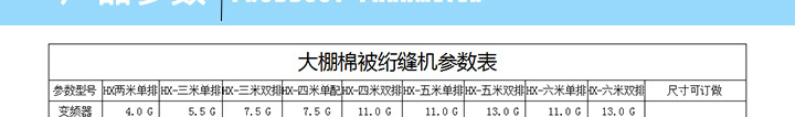 產品簡介:保溫被機是專門生產大棚保溫被的一種機器。理想的保溫被應具有傳熱系數小,保溫性好,重量適中,易于卷放,防風性、防水性好,使用壽命長等優點。大棚保溫被機為了生產這種保溫被,經過多年的努力終于,生產出了一種專業生產大棚棉被的絎縫機,又被稱為3米寬幅雙梁大棚棉被機(44針)。 本3米寬幅雙梁44針大棚保溫被機(雙梁大棚保溫被機)所縫的單線鏈式針跡,具有線跡美觀、富有彈性、線鏈牢固、拆線方便等優點。把易損易壞的部件改換耐磨材料,克服不易調整、維修的缺點,增加電控系統,使機器更好操作等特點。